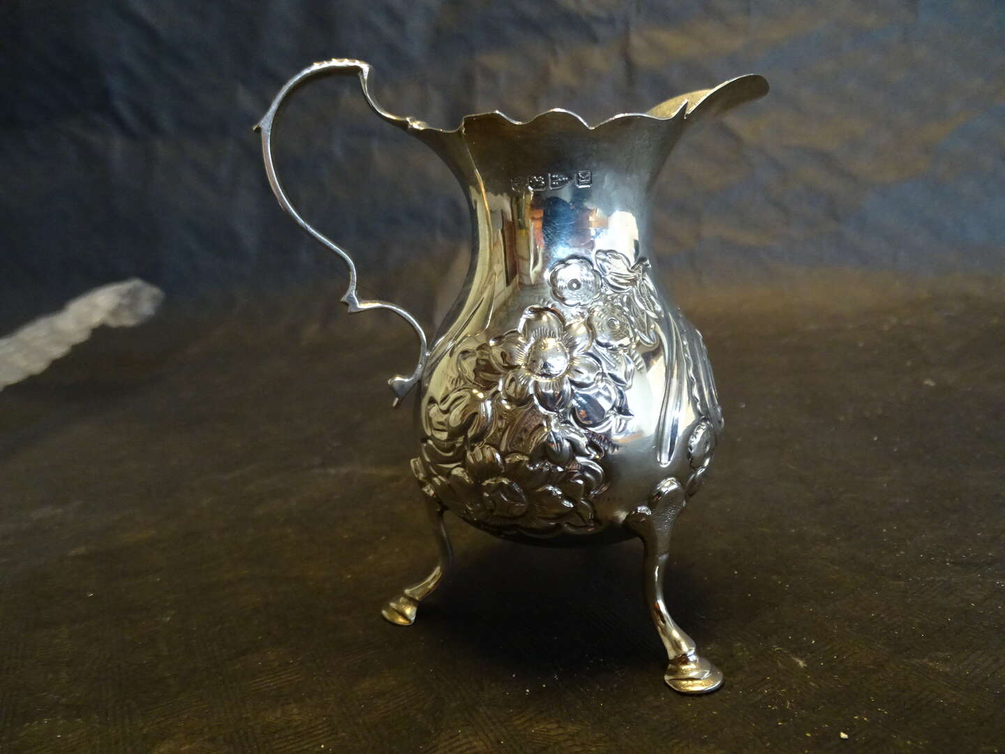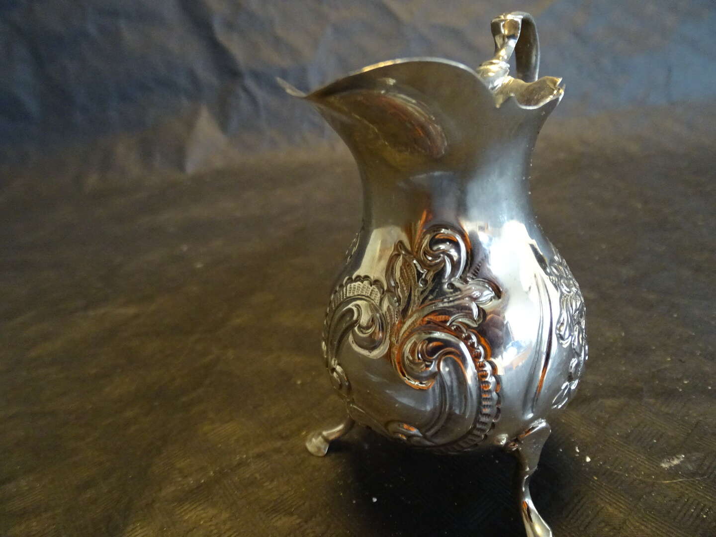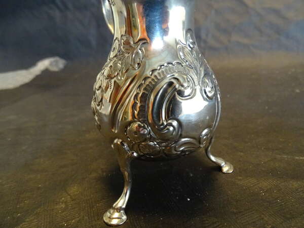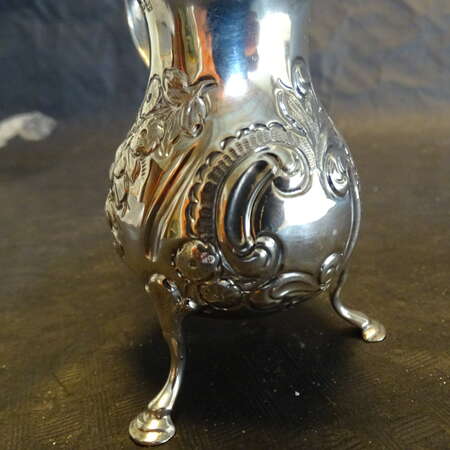 A stunning English antique silver creamer- 925 silver. Floral and follage repousse detailling. Vacant central cartouche of which could be engraved if you so desire. Tripod hoof feet. Measering 9 cm high based to the spout x10 cm high based to the top of the handle x 4,2 ri diameter . Exellent condition. James Deakin & William Deakin 1893 UK.