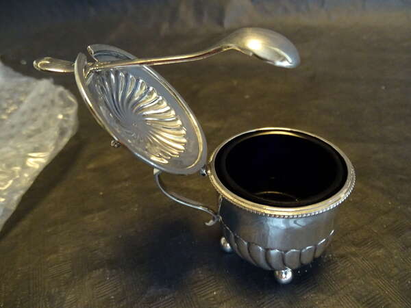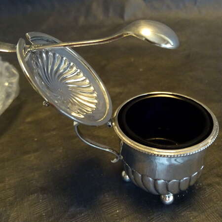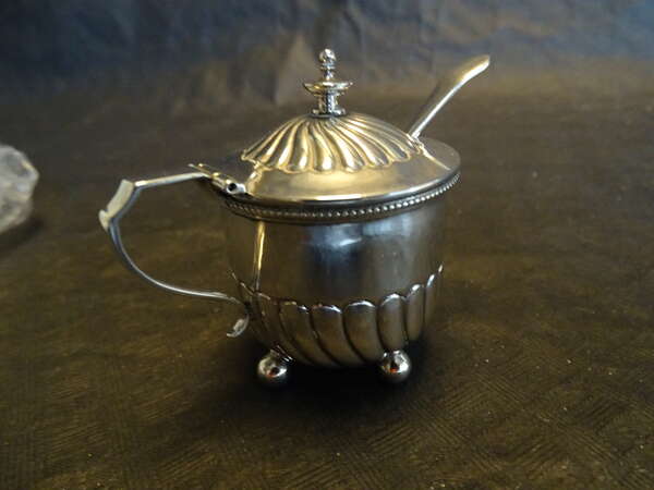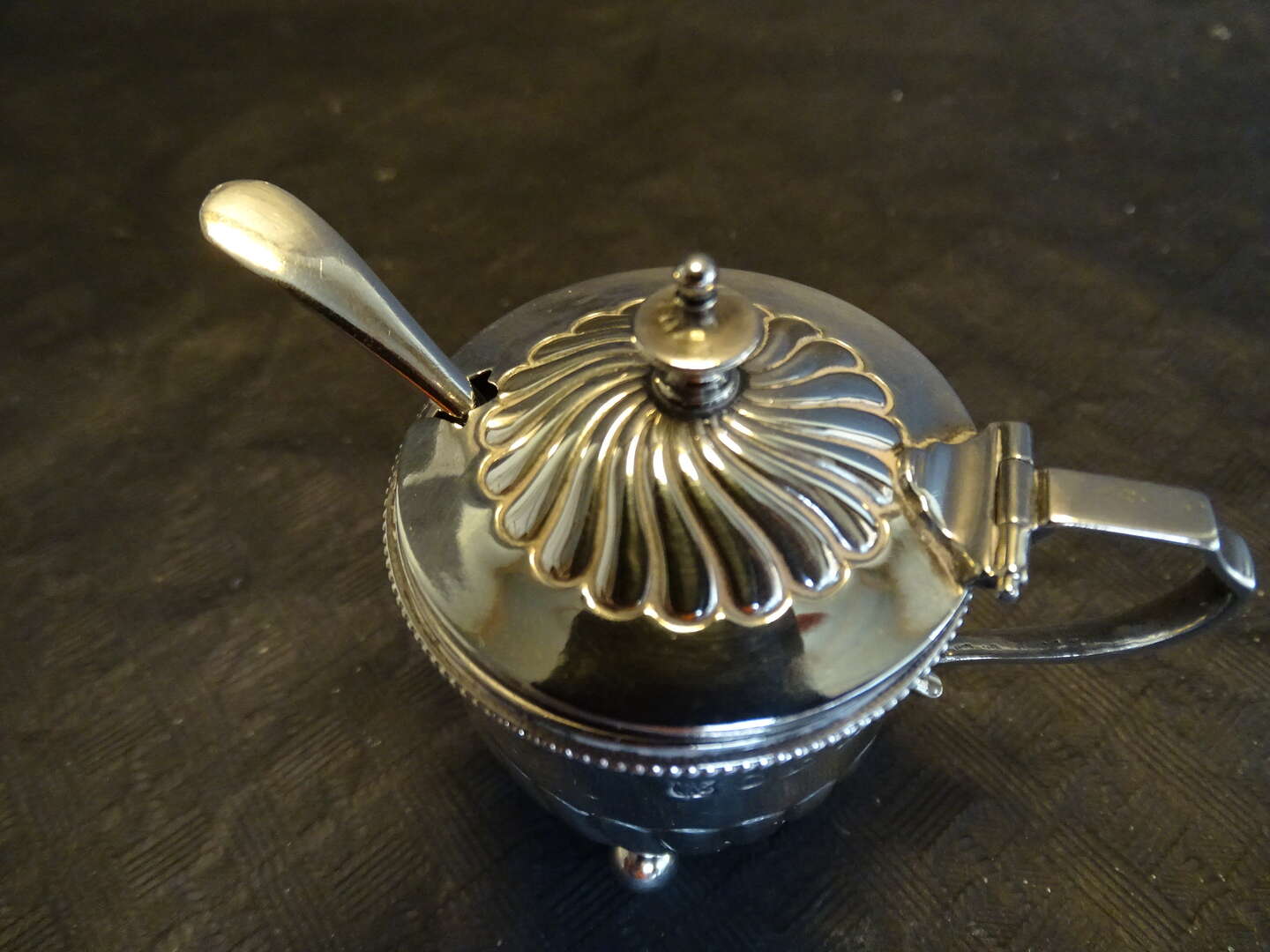 Sterling silver Victorian mustard pot w/ George spoon. Hallmarked Birmingham 1888. Initials WG over J.L of the makers William Gibson & John Lawrence Langman. Bleu glass liner. Richly enbossed on pot and lid. Standing on three ball feet. Measures approx 60 mm in lenght including handle , stands approx 60 mm , in height including feet end finial. Silver weight approx 46 grams. Sterling silver spoon Hallmarked AP & Co of the makers Arthur Price & Co Ltd : spoon approx 70 mm long , approx 6 grams weight. Good condition commensurate with time and use.