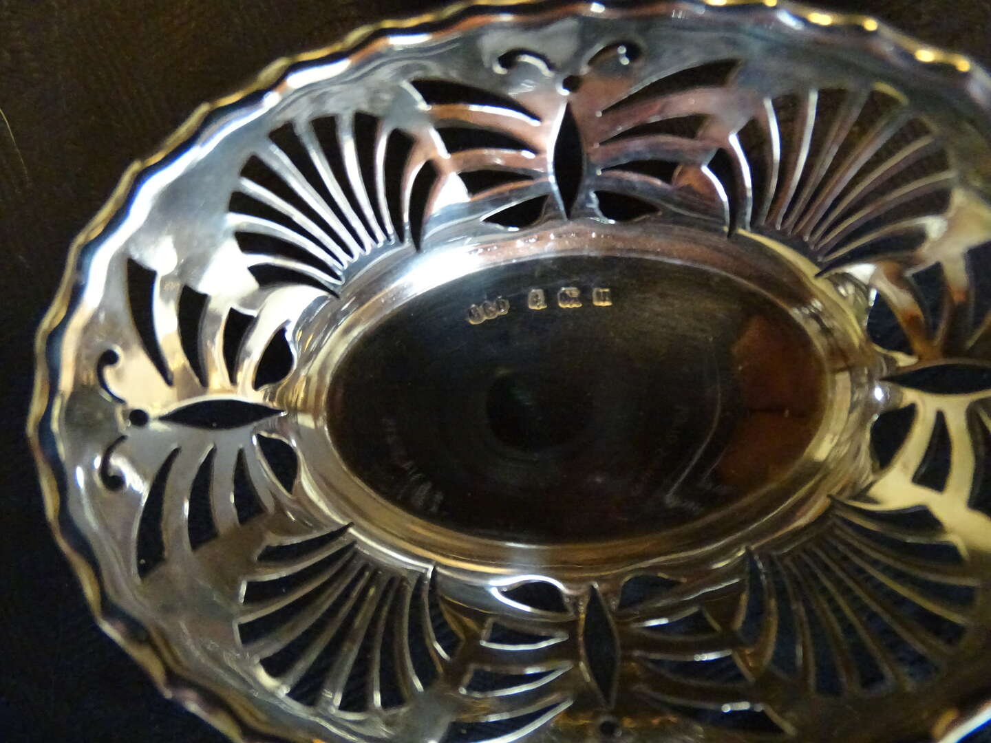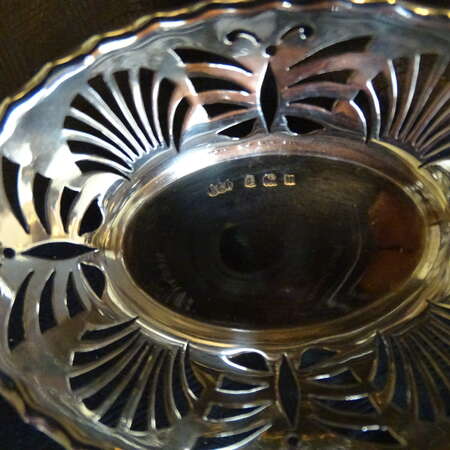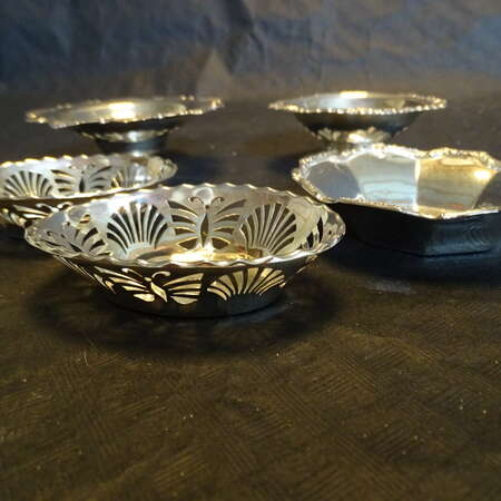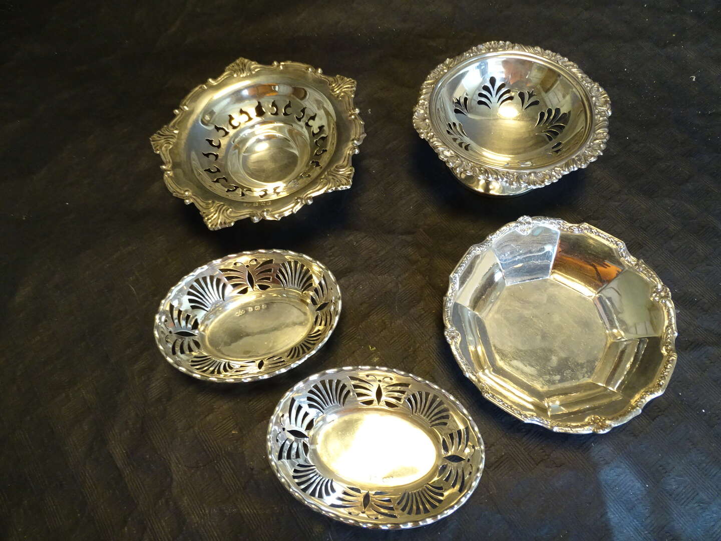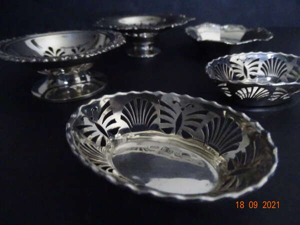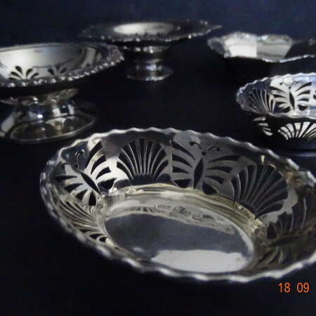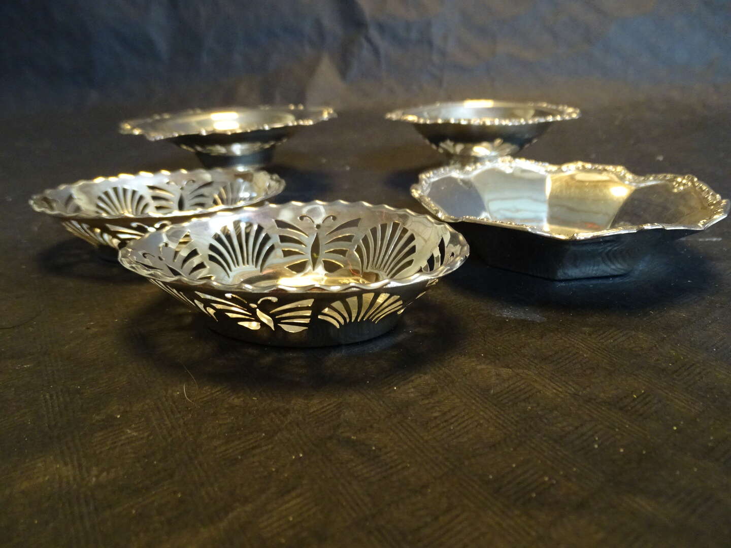 Five Sterling bonbon/ pin / nut dishes: one pair. Hallmarked Birmingham 1932 - 1906- 1908 and Birmingham 1932 pair. Initials of the makers : Adie Brothers Ltd,William Hutton & Sons Ltd- 2 x and Henry Clifford Davis Ltd -pair. Ornated and pierced decoratrion on body and rim of the dishes. Measures : approx 90 mm diameter and approx 20 mm in height , approx 100 mm in diameter and approx 35 mm in height including foot, 85 mm in diameter an 35 mm in height including foot, two dishes of each 75 mm in lenght and approx 18 mm in height . Combined silver weight 134 gr. The five dishes are in good condition commensurate with time and use.