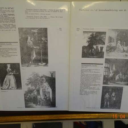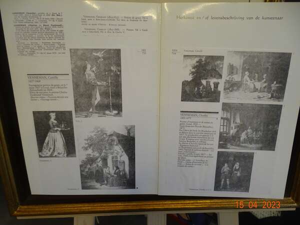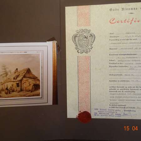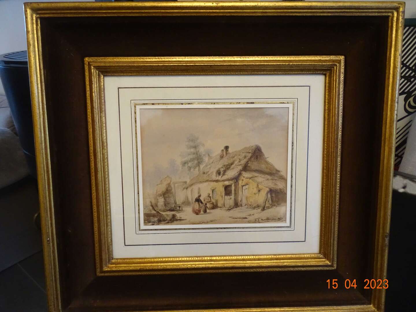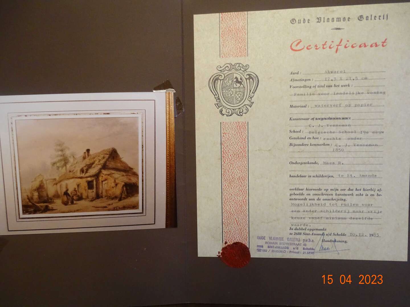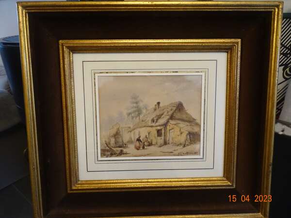 " Familie voor landelijke woning " C.J. Venneman , met certificaat , waterverf op papier , Akwarel, 17,3 x 21,5 cm . Belgische School 19e eeuw. Afmeting met kader : 48 cm x45 cm , gewicht :