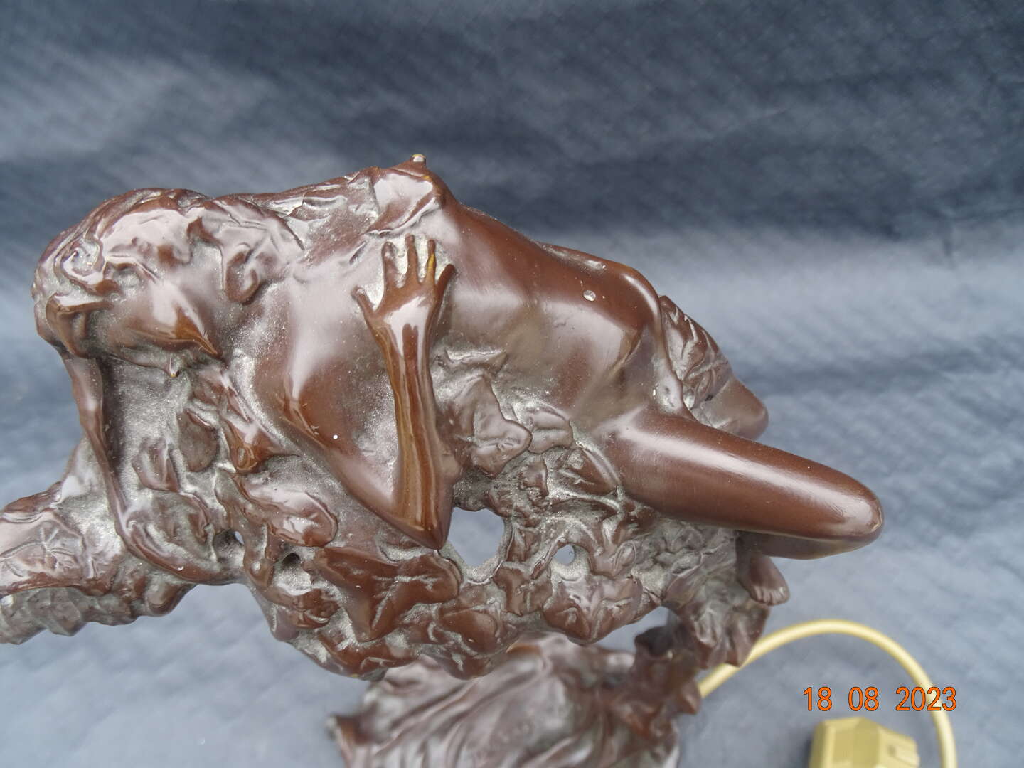 " Lamp in brons, versierd met liggend naakt" getekend EJ nr A550 , hoogte 31 cm