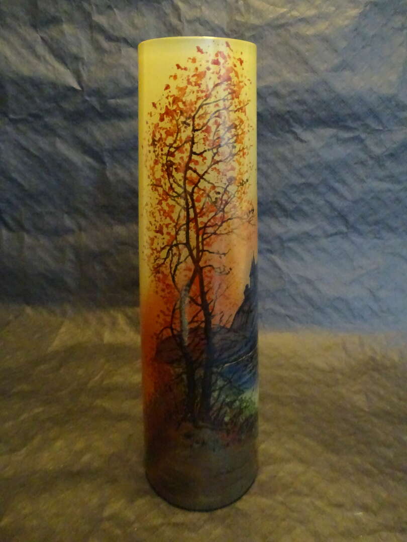 Prachtige Art Nouveau vaas met geêmailleerde decoratie van een merenlandschap in de schemering - Gesigneerd , Frankrijk ca 1900, handbeschilderd geblazen glas. Hoge vaas met een uitvergrote voet met een oranjegele bewolkte achtergrond met een prachtig merenlandschap in de schemering met vele sublieme tinten, met de hand beschilderd met een kasteel torenhoog op de top van een heuvel met enkele vliegende vogels en bomen met herfstkleuren. Zeldzame hoogte 350 mm. Gesigneerd met " Leg" in het decor. Authentiek verklaard in de beroemde catalogus Répertoire Raisonné Legras , "Verrerie artistique et populaire française". In goede staat ,mooie email en zeer heldere kleuren, lichte ouderdomssporen aan de buitenkant van de hals. Gew. : 1,020 kg