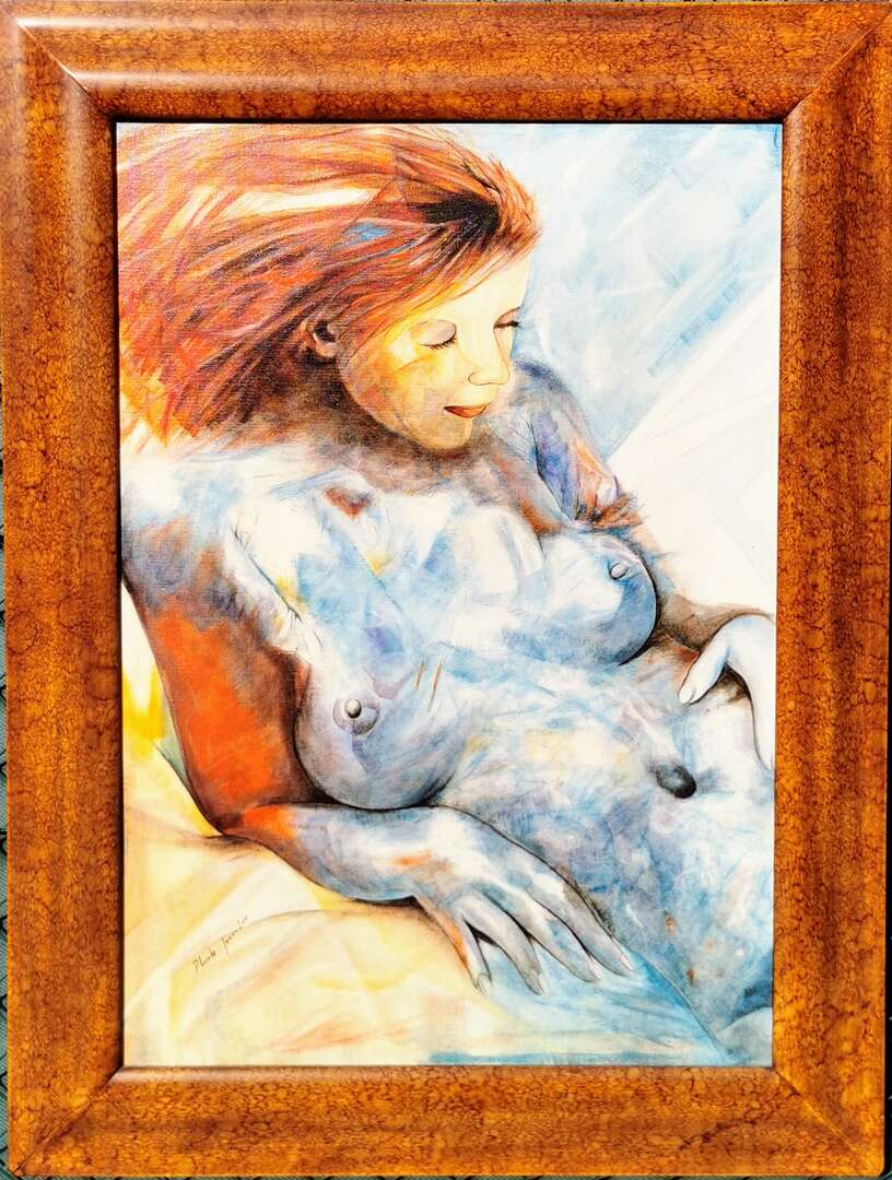 " Body blue " Jean- Luc Plancke , olieverf op doek . Geboren en getogen in Moorsele , West-Vlaanderen ( Belgium). Al op jonge leeftijd vervaardigde hij op didactische wijze portrettekeningen met Chinese inkt en houtskool en niet vlug later olieverf en pastelkrijt op doek. Hij was zeer goed bevriend met Rpger Van Belleghem ( 1928-2002). Expositie in Oostende, Eupen en verschillende kunstevents. Kenmerkend voor zijn werken is dat de vrouw op een melancholische manier centraal staat. Afm. werk 110 cm x 90 cm