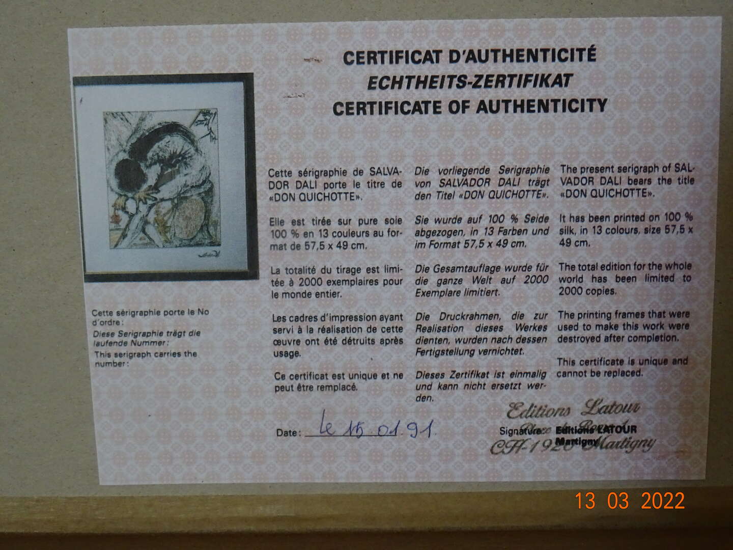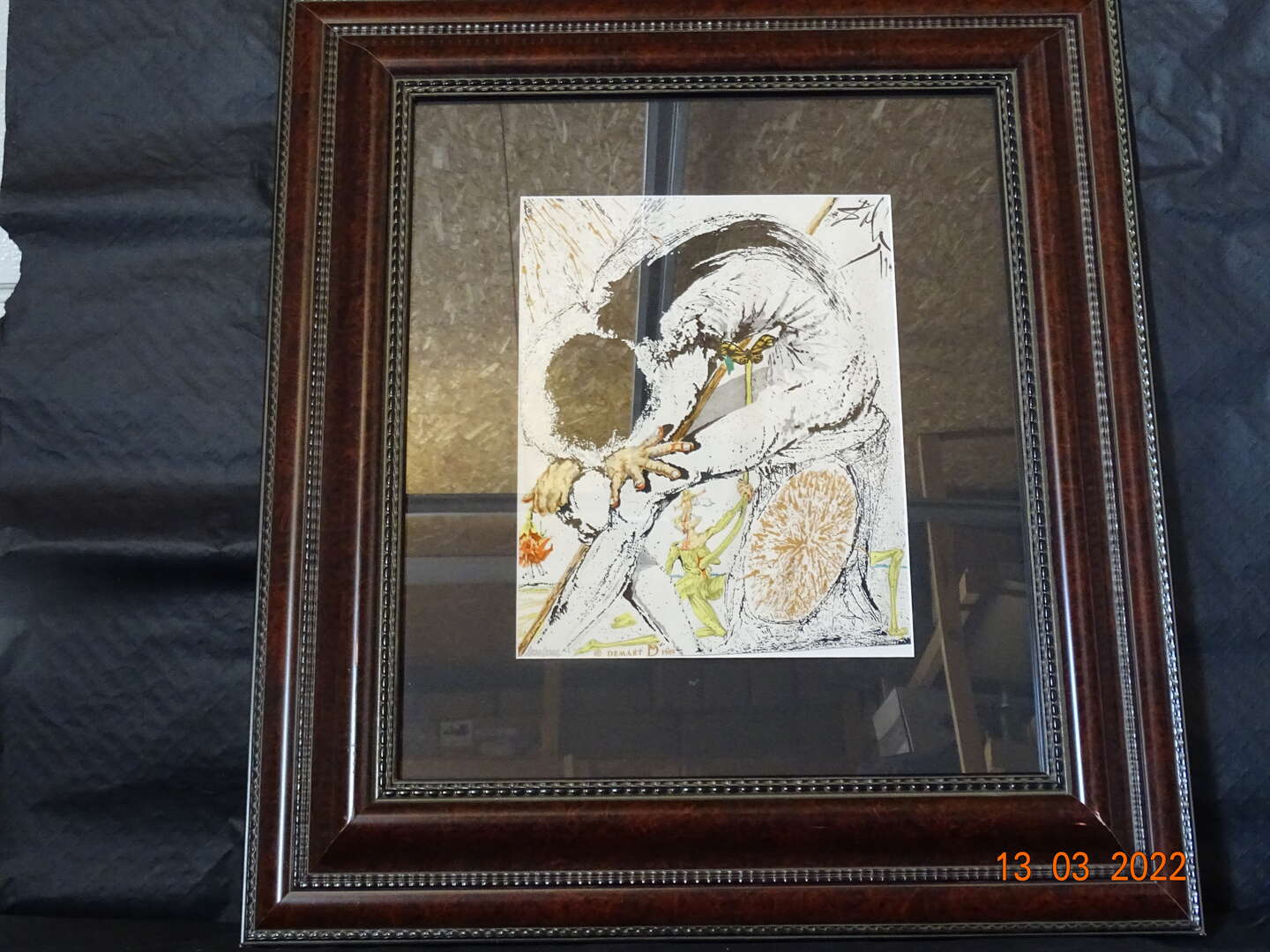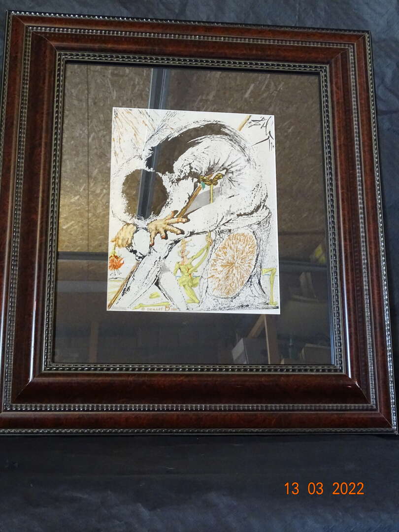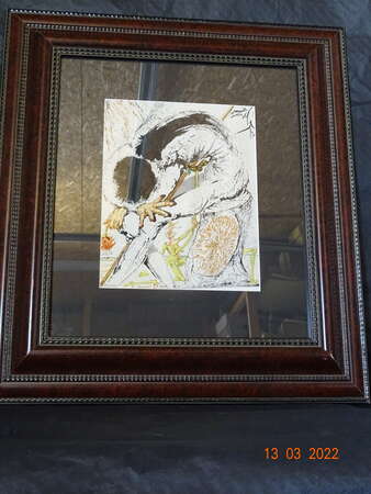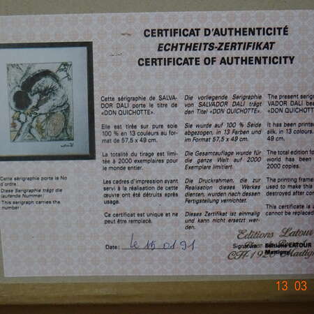 " Don Quichotte " Salvador Dali ( 1904-1989 ) - Seriegrafie op zijde - Getekend in de plaat - genummerd 1800/2000 - Achteraan certificaat ; afm 31 cm x 39 cm , met kader :