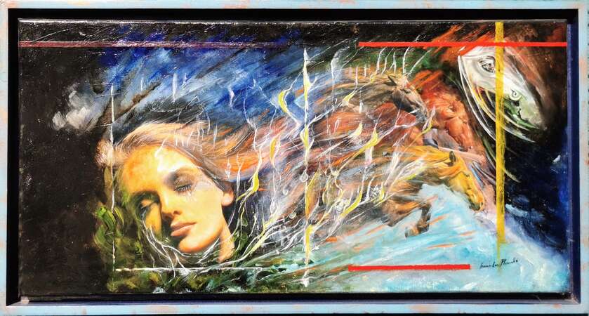 "Her Horse " Jean- Luc Plancke , olieverf op doek . Geboren en getogen in Moorsele , West-Vlaanderen ( Belgium). Al op jonge leeftijd vervaardigde hij op didactische wijze portrettekeningen met Chinese inkt en houtskool en niet vlug later olieverf en pastelkrijt op doek. Hij was zeer goed bevriend met Rpger Van Belleghem ( 1928-2002). Expositie in Oostende, Eupen en verschillende kunstevents. Kenmerkend voor zijn werken is dat de vrouw op een melancholische manier centraal staat. Afm. werk 65 cm x 35 cm