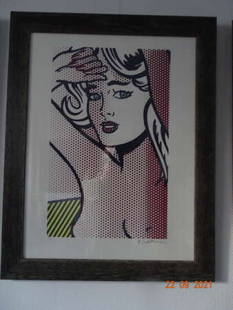 " Jonge vrouw met hand aan voorhoofd" Roy Lichtenstein , Zeefdruk - getekend in de plaat - Genummerd 23/199 - afm. : 56 cm x 43 cm. Met kader 70 cm x 89 xcm.
