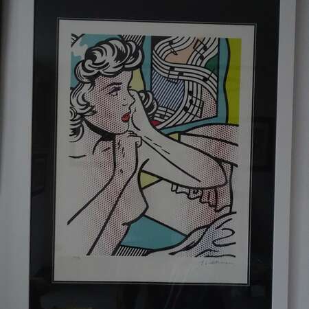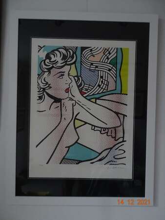 " Jonge vrouw met muziek " Zeefdruk - Roy Lichtenstein ( 1928-1997) Getekend en genummerd 87/199 . Grootformaat afm. 63 cm x 84 cm met prachtig groot kader 88 cm x 115 cm . Gewicht 7,5 kg