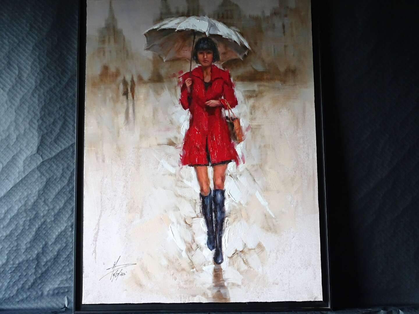 " Jonge vrouw met paraplu" Olieverf op doek ,getekend Antonio Palmeri. Afm.: B 90 cm x H 120 cm. met kader 97 cm x 127 cm.