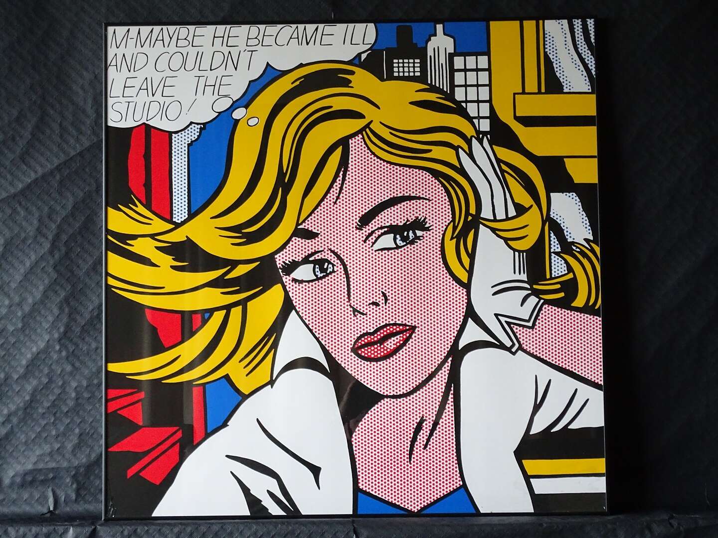 " Maybe he became ill" Gekleurde zeefdruk , getekend Roy Lichtenstein , afm. 90 cm x 90 cm. Met kader 94 cm x94 cm.