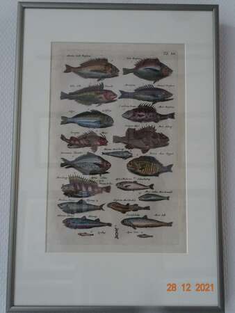 Folio engravings by Matthäus Merian /2 ( 1593-1650) Fish : Scorpionfish Smelt Herring Sea Beam - Hand coloured engravings - 1657 . Afm 37cm x 23 cm , met prachtige Nielsen kader 30 cm x 45 cm .