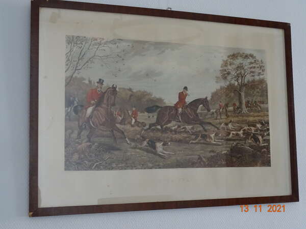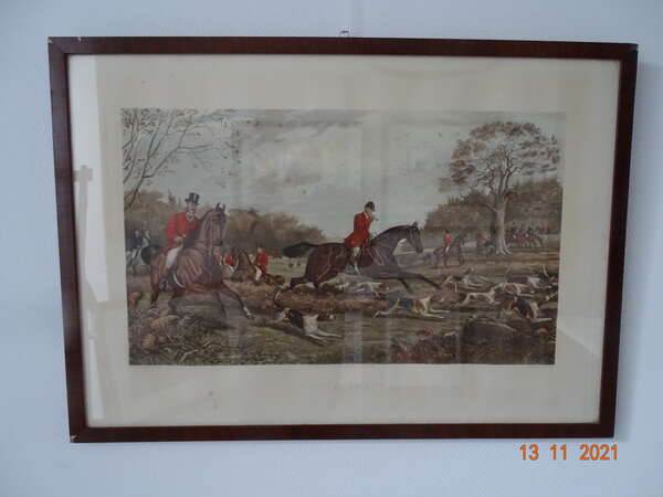 " Gone Away" Oude Engelse gekleurde jachtgravure. Painted by SHELDON-WILLIAMS - Engraved by E.G. HESTER. Published By R. POWELL , 6 , Grove , Rd , Brixton S.W. Afm : 60 cm x 35 cm met kader 78 cm x 58 cm.